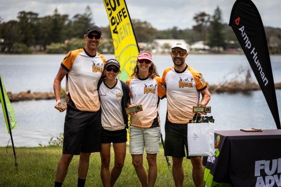 The final leg of the race was a short paddle up the Camden Haven inlet to finish back at the start point, in Dunbogan. This paddle leg started with a 1.5km portage – not the best way to finish a race. Some teams planned ahead and brought trolleys while others just toughed it out. Tide definitely played a factor with the paddle and in the 36hr race Tiger Adventure and Tigeroos nailed the leg finishing in under 90min. In the 20hr course the all-girl teams of Whine Later (T4) and Karaka (T2) were the best placed paddlers in 100mins.