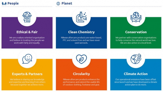 - Ethical and Fair: As a values-orientated business, Nikwax believes in treating the people it works with (internally and externally) fairly and equally. Commitment: To become an Employee Owned Trust in 2022 and donate 1%+ of revenue to social and environmental causes. Additionally, by 2025 Nikwax hopes to have all suppliers at a Premium Sustainability Performance level.