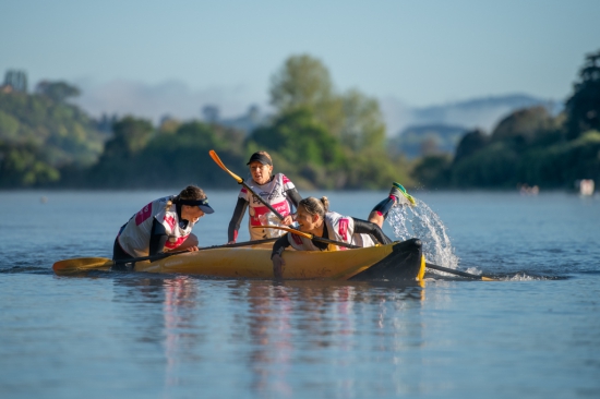 There was some close and exciting racing as the teams did an anticlockwise loop around upper Lake Karapiro. In the end it was won by Super Veteran team Forever Young Bayleys Orewa (Kirsty Macky, Liz Andrews, Robyn Currin) 4:02:54, second was Veteran team 3 Peez (Alison Perrett, Tania Dugdale, Shannon Perrett) 4:14:49, and finishing in third overall was Open team Crazy Cougards (Debbie Hansen, Be a Bagnall, Natasha Fickling) 4:20:27.