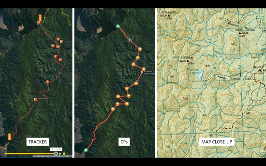 The picture shows the tracking map on the left, all 11 CP locations in the middle, and the contour map sample on the right for the upper section of the stage.